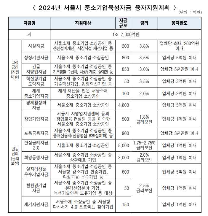 서울시는 고물가·고금리에 따른 중소기업·소상공인의 경영 위기 극복을 위해 ‘2024년도 중소기업육성자금’을 전년 대비 1천억 원 늘린 1조 7천억 원 규모로 지원한다고 밝혔다.이번에 공급하는 자금은 크게 두 가지로 나뉜다. 첫 번째는 시설자금‧긴급자영업 자금 등 ‘고정금리·직접대출자금’으로, 총 2천억 원 규모다. 두 번째는 희망동행자금‧안심금리자금 2.0 등 ‘변동금리·금리보전자금’으로, 총 1조 5천억 원 규모다.