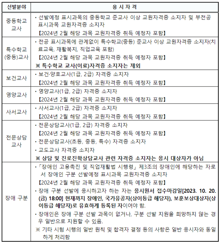 ※ 비교수 교과 선발예정 인원은 보건(초등 11명, 중등 7명), 영양(초등 21명, 중등 5명), 사서(초등 3명), 전문상담(초등 7명, 중등 9명) 총 63명을 통합선발하며, 최종 합격자의 학교급(유ㆍ초ㆍ중등) 임용은 우리 교육청의 임용 계획에 의합니다.